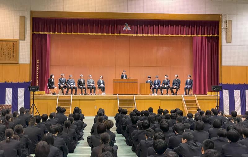 3学期終業式では、学校長より「元日の被災により、命の大切さやこれからの生き方を考える機会を得ることができた。慌てることなく、一歩ずつ前進していってほしい。周りで困っている人や不安な人がいたら、サポートできる人になってほしい。また、皆さんは地域や地域の文化を支える大切な人材であるため、考えることを続けていってほしい。」と1年間の総括をしていただきました。その後の全校集会では、各課より春休みの過ごし方について注意がありました。