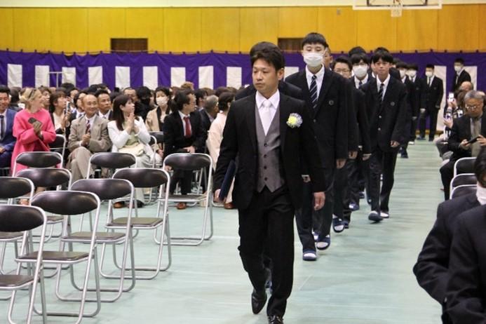 花束を贈呈しました。別れと出会いの季節、生徒や教職員の胸に残る大切な一日になりました。