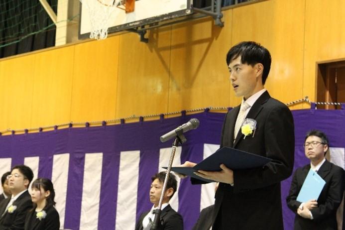 在校生代表として、前期生徒会会長の機械システム科3年生堀納晃介さんが「学校行事や部活動など様々な経験を通じて、楽しく充実した学校生活を送ってください。」と歓迎の言葉を述べました。