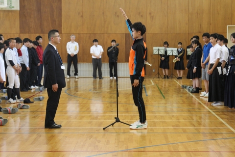 北野教頭先生激励の言葉、生徒会長激励の言葉に続いて、各部のキャプテンや部長が大会会場や対戦相手等を説明し、それに向けての抱負と決意等を述べました。そして応援団によるリードの下、全校生徒で校歌や応援歌を歌い、エールを送ったあと、陸上部主将による選手宣誓と続いて、壮行式が終了しました。