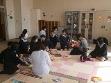 10月5日(金)5・6限、保育の意義、親の役割を考えることを目的とした、親子交流授業が語学教室でありました。3年生の「子どもの発達と保育」選択者12名を対象とし、「チャイルドケアハウス小丸山」スタッフの2名を含め、その利用者である親子5組をお招きしました。生徒たちは、保護者から子育ての体験談を聞き、乳幼児と触れ合うことで、心身の発達について観察し、貴重な体験をすることができました。