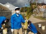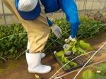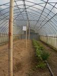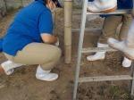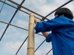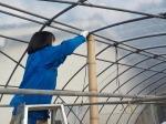 野菜のビニールハウスでも対応が必要です。3人一組になって、脚立を用いながら支柱を立てる作業を行いました。安全に気を付けて、脚立を使う際はストッパーをかませること、落ちないように下で支えること、などを確認し、2棟分の支柱を立てました。