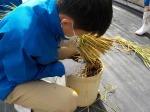 一人一ポットずつイネを育てその生育を観察してきましたが、10月26日、いよいよ刈り取りを迎えました。片手では持ちきれないほどに増えた茎の束をノコギリ鎌で刈ります。「一本の苗からこんなに大きくなってびっくりしており、中には思うように刈り取りできず、手こずる生徒も見受けられした。刈り取ったイネは束ねて2週間ほど乾燥させます。
