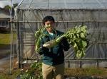 昨年の10月下旬からは、ハウス内でアブラナ科の野菜を中心とした葉菜類の栽培を行っています。小松菜、水菜、チンゲンサイ、小カブ、かつお菜、ホウレンソウ、スイスチャードなどが植わっています。