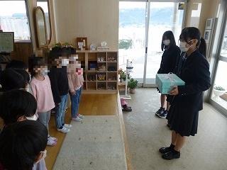玄関で年長の子ども達に手渡すことができました。子どもたちは、かわいくて元気な声で「ありがとうございました!」と言ってくれました。もうすぐクリスマスです。生徒達が作った絵本であたたかい気持ちになってくれればよいなあ、と思います。