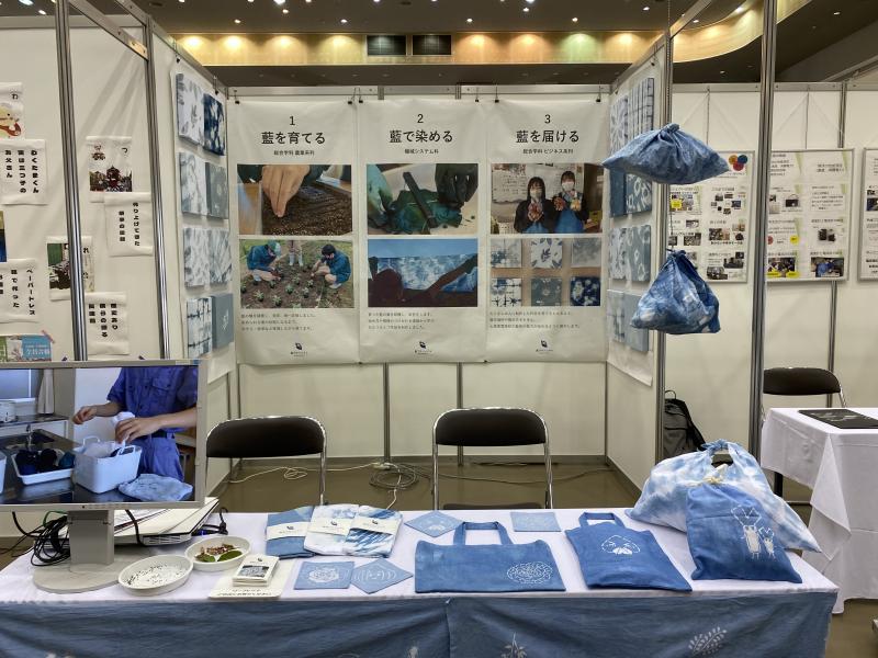 産学連携展示ブースでは、自分たちで染めたエプロンを着て、今までの取り組みを来場者に説明しています。