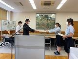 伝達表彰式では、陸上競技部の濵田匠くん・表涼太くん・浜名凛空くん・寺西幸心くん、ウエイトリフティング部の吉野樹くん・引田葵さん、ビジネス研究部の宝池彩香さんが表彰されました。