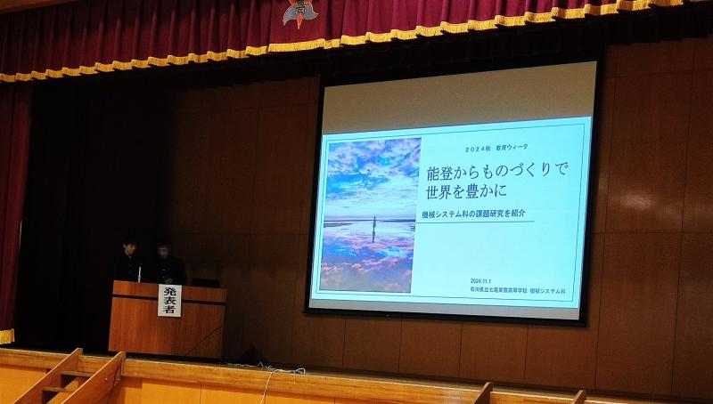 11月1日(金)~7日(木)は「いしかわ教育ウィーク」で学校を公開しています。1日(金)の午後は、第1体育館を会場にして本校の「特色ある取組」が行われました。「特色ある取組」は各科発表会でした。機械システム科、演劇科、総合学科農業系列、総合学科ビジネス系列の順で、各科・系列が取り組んでいる活動内容について代表者が発表しました。機械システム科、総合学科はスライドを用いて活動状況を分かりやすくまとめて発表し、演劇科では2年生が特別授業のワークショップの一場面を、1・3年生は校歌を歌いながらモダンダンスを披露しました。この活動を通して、生徒たちは相互理解を深めることができました。