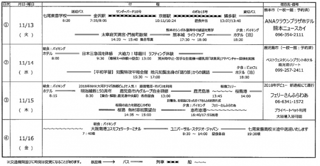 4日間とも晴天に恵まれましたが、帰りのフェリーのエンジントラブルのため、最終日の予定を変更せざるを得なくなりました。鹿児島市内の自主研修時間の短縮、桜島上陸の取りやめ、新幹線で久留米駅へ出て、別府港からフェリーで大阪に向かうことになりました。それでも生徒たちにとって、この3泊4日は高校生活にとって忘れられない思い出になったようです。