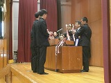 続いて、表彰伝達式を行いました。11月の新人戦を中心とした各種大会や文化行事等で優秀な成績を修めた生徒に、校長先生が賞状を手渡し、全校生徒に披露し祝福の拍手を送りました。