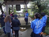 初めに一本杉通りにある「昆布海産物處しら井」「鳥井醤油店」「高澤ロウソク店」の3つのお店を紹介しました。続いてバスに乗って「妙観院」へ移動し紹介、そして最後に「和倉温泉総湯」へ向かいました。この日は金沢市で今年初めての初雪があり、県内各地で最低気温を観測しました。途中雨に降られ、寒さに震えながらのガイドとなりましたが、総湯では高校生と一緒に留学生も足湯も実際に体験しました。