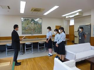 7月25日(月)、校長室で大会に向けて激励会が行われました。部長の山本さん、副部長の卜部さん、部員の飯室さんが校長先生から激励を受けました。「明日の発表会では、優勝目指して頑張ってきます」と山本さんが言葉を述べました。