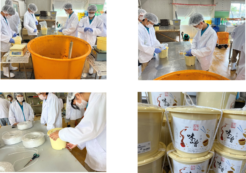 生徒は暑い部屋で味噌の匂いがたちこめる中、男子は10kgと4kgの樽に味噌を詰め、女子は樽を紐で縛る作業、900g入りパックへのパック詰め、樽とパックへのシール貼りなどを担当して行いました。今回包装した商品は七尾、中能登のJA直売所、毎週木曜日に実施している校内販売で販売されますので、ぜひ見かけたら手にとってみてください。