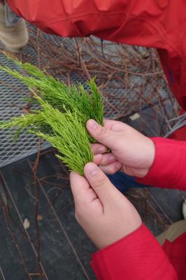 ペイントしたまつぼっくり、コニファー、ゴールドクレスト、なんてんの実を使って飾り付けします。今回はセイヨウキズタの葦(放っておくと木を傷める)を有効活用します。材料はすべて学校の敷地から拾ってきました。