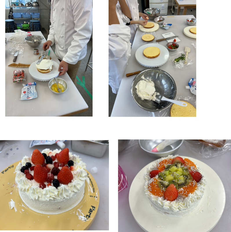 最初にスポンジ生地の製造です。家でもスポンジ生地を作ったことがある生徒もいれば全く初めての生徒もいて、生地の膨らみに若干の差はあったものの生地をうまく焼くことに成功!そして、肝心のデコレーションは学校で用意した生クリームとイチゴのほかに生徒が自ら様々なフルーツや飾りを持ち寄ったものを使い、個性豊かなデコレーションを完成させました。