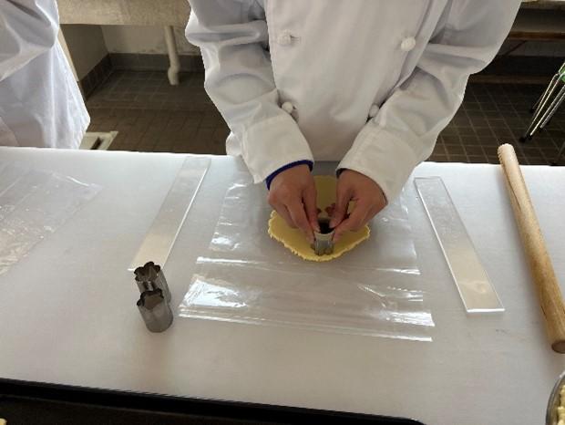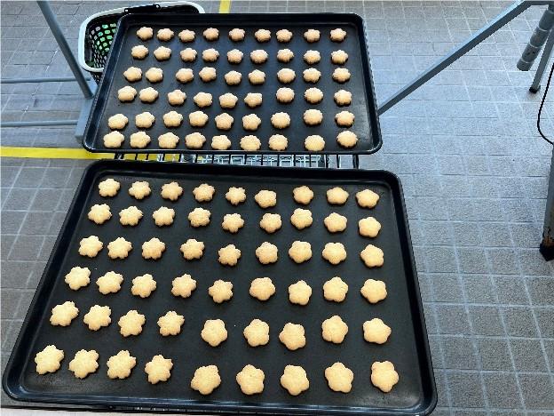 型抜きで綺麗な形を作っていました。集中力を切らさずに全ての生地を時間内に成型し、焼成し終えること