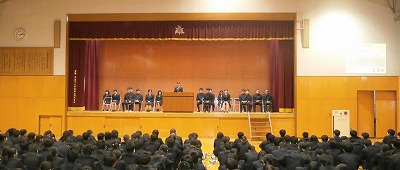 平成29年度後期生徒会長から歓迎の言葉、校長先生からの挨拶、そして新入生代表挨拶と続き、新入生と2・3年生の代表二人が握手をして対面式は終わりました。