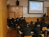などを目的としており、能登地域活性化人材確保推進実行委員会が主催者となっています。2年生全員が7会場のうち2会場を選びました。1社あたり約10分~13分の持ち時間の中で、仕事内容、社会人として必要なこと、地元で働くことの魅力などについて語っていただきました。その後質疑応答の時間をもつ形式で行われましたが、話を聞く生徒はメモを取りながら真剣に耳を傾け、大変有意義な時間となりました。