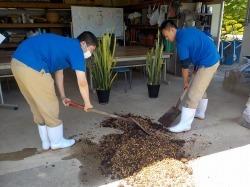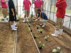 9月15日、「野菜」の実習でビニールハウス内に定植していきます。ブロッコリーはアブラナ科であること、生長すると株が大きくなるので株間は60cmで植え付けることを確認し、定植作業を行いました。1棟のハウスに180本のブロッコリーを植え付けました。順調にいけば、11月に収穫予定です。