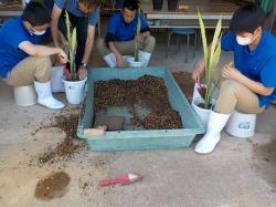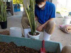 職員室に飾ってあった観葉植物・サンスベリア。一部の葉が黄色くなり、根が鉢いっぱいに張って詰まっているようなので株分けを行いました。生育の旺盛なこの時期に行うことで、植物体のダメージを最小限に抑えることができます。