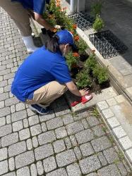 花壇に定植する際のポイントはバランスに気を付けることです。バランスが悪いと見ごろの時期になると見た目が悪くなってしまいます。徳田駅の花壇では、2列で正三角形を作り、列でしっかり一直線になるように周りの花と比べて位置を調整しながら定植を行いました。