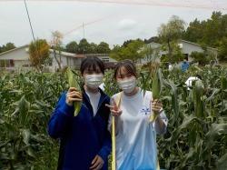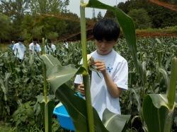 蒸し暑い畑の中ですが、「どれがいいか」とトウモロコシを選ぶ生徒の目は真剣です。中には、実から“イモ虫”(アワノメイガの幼虫)が出てきて「ギャ~っ!」という叫び声も聞こえてきました。