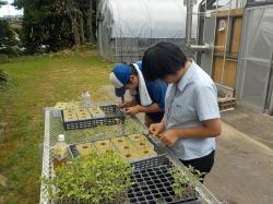 7月7日に7種類のトマトを播種し、セルトレイで芽出しさせました。夏休みに入って7月28日、一辺が10cmほどのサイコロ状のロックウール培地(RW)に仮定植しました。3年生は就職・進学に向けての活動がある中その合間をぬって、トマトの世話も行います。
