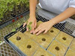 RWに十分吸水させた後、芽出ししたトマトの苗を一本ずつRWに植え付けていきます。培地に根が張るように、苗を植穴にしっかり植え付けることが大切です。また今回は、1つの苗から2本の茎を伸ばす2本仕立てというやり方に挑戦します。