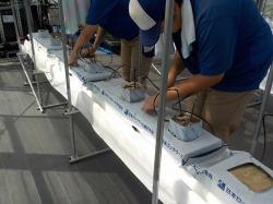 すべてのRWに定植が終わると、肥料管理機のスイッチを入れました。養液の濃度は、生育初期の場合EC1.2で設定しました。最後に給液のタイミングをタイマーでセットしました。8時から開始し2時間おきに5分ずつ給液するように設定しました。