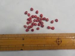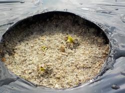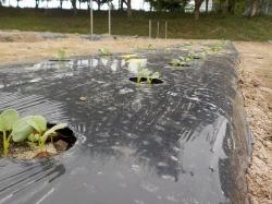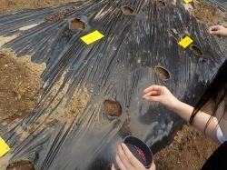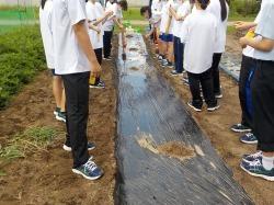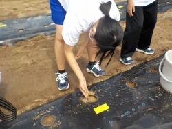 株間40センチ間隔でマルチに穴をあけた後、種を播きやすいように土を均します。一人当たり3か所が割り当てられ、1か所につき4粒の種を播きました。その後覆土・水やりをして終了です。2~3日で発芽してきます。2~3mmの種ですが初めて見る生徒もいて、その小ささにびっくりしていました。