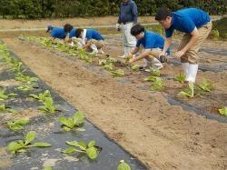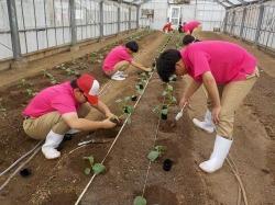 1畝に120本以上定植します。最初はぎこちなかった手つきも数をこなすうちに慣れ、要領もよくなってきました。立ったりしゃがんだりの繰り返しで作業は大変ですが、休憩時には農場でとれたスイカを頬張り水分補給しました。甘くておいしかったぁ~。