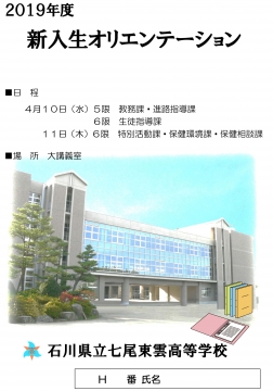 4月10日(水)5限から1年生を対象にしたオリエンテーションが大講義室を会場にしてありました。本校での学習面と生活面を中心に、安心・安全にそして充実した高校生活を送るための手引きとなるものです。生徒たちは途中メモを取ったり、マーカーで下線を引いたりして、熱心に耳を傾けていました。