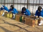 ハウス内に小さなトンネルを作り、保温用の温床マットを敷いてその上に苗箱を並べます。25℃前後で管理し、約一週間で発芽します。