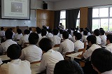 8時50分から4階大講義室で行った開校式では、学校長挨拶、小浦生徒会長の歓迎の挨拶があり、本校の学校概要説明と続きました。その後各教室に移動して工業、演劇、農業、商業の4系列に分かれて授業を2時間受け、大講義室に戻ってアンケートを記入、閉校式と続きました。