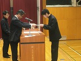 続いて、表彰伝達式を行いました。11月の新人戦を中心とした各種大会や文化行事等で優秀な成績を修めた生徒に、校長先生が賞状を手渡し、全校生徒に披露し祝福の拍手を送りました。