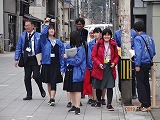 留学生が乗ったバスが13時に本校に到着し、総合経営学科商業系列ビジネスコースの生徒16名がバスに同乗して、スタート地点にあたる七尾市街に向かいました。ベトナム、タイ、バングラデシュ、インドネシアなどから8名の留学生が参加し、3班に分かれて自己紹介をしました。この時点ですでに笑い声が聞こえ、コミュニケーションが取れているようでした。そして、全員で一本杉通りのスタートにあたる仙対橋に向かいました。一本杉通りの歴史説明で、“出会いの一本杉”という昔話から、女子トークで盛り上がりを見せました。実は参加生徒16名中女子が13名、留学生8名中女性が7名だったからです。