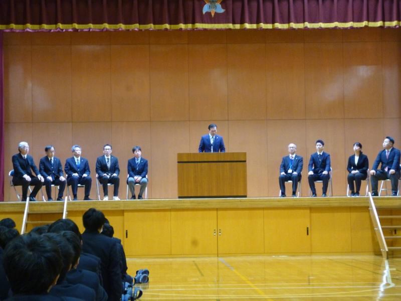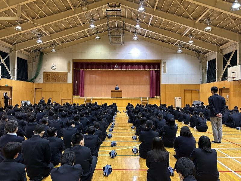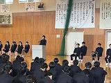 3学期終業式では、学校長より「元日の被災により、命の大切さやこれからの生き方を考える機会を得ることができた。慌てることなく、一歩ずつ前進していってほしい。周りで困っている人や不安な人がいたら、サポートできる人になってほしい。また、皆さんは地域や地域の文化を支える大切な人材であるため、考えることを続けていってほしい。」と1年間の総括をしていただきました。その後の全校集会では、各課より春休みの過ごし方について注意がありました。