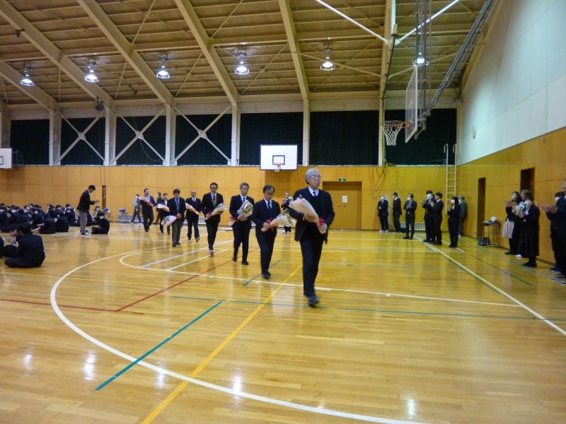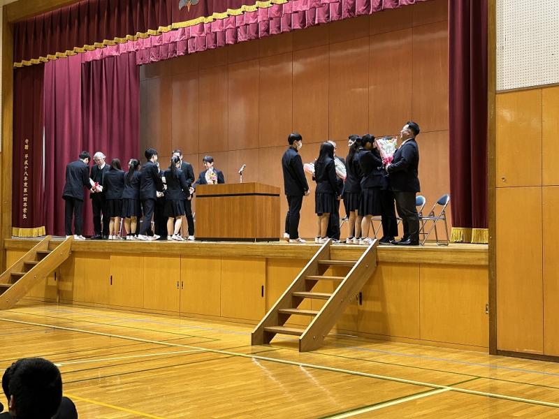 花束を贈呈しました。別れと出会いの季節、生徒や教職員の胸に残る大切な一日になりました。