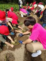 新型コロナウイルスの影響により実施が見送りとなっていた幼稚園との交流活動プログラムの一つ「サツマイモ収穫体験」を4年ぶりに実施しました。