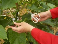 まずは収穫です。収穫用のハサミの長さ16cmを基準にそれよりも長いものを収穫します。大きな葉の裏になって隠れているキュウリもあり、一つひとつ丁寧に探していきます。葉や茎に触れると細かく堅い毛が肌にあたり「キュウリ、痛い!」を声をあげる生徒がいました。軸(果梗)をハサミで切ると、すぐにキュウリの汁(樹液)がしたたり落ちてきます。その様子に驚いている生徒もいました。