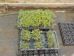 7月7日に7種類のトマトを播種し、セルトレイで芽出しさせました。夏休みに入って7月28日、一辺が10cmほどのサイコロ状のロックウール培地(RW)に仮定植しました。3年生は就職・進学に向けての活動がある中その合間をぬって、トマトの世話も行います。
