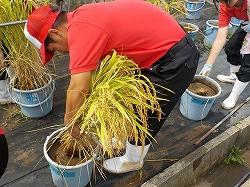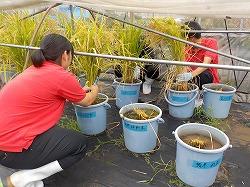 9月10~11日にかけて、最後の生育調査として「草丈」と「茎数」を測定した後、栽培していたバケツイネを鎌で刈り取りました。