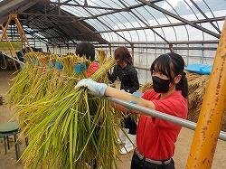 刈り取ったイネは束ねて1週間ほど“はぞ”に干します。