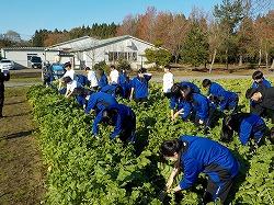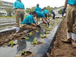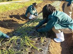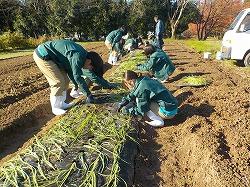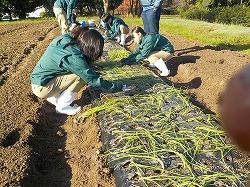 11月初旬までに注文をいただいた分の出荷を全て終え、13日の実習では学校でタマネギの定植を行いました。鉛筆の太さぐらいに成長した苗を一本一本畑に丁寧に植えていきました。