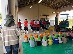 9月25日。葉菜類は、コマツナ・チンゲンサイ・小カブ・ミズナ・カツオナの種を播きました。いずれもダイコンやハクサイと同じアブラナ科の野菜ですが、同じ科の野菜と聞いて驚いている生徒もいました。ある程度の大きさに育てた後、ハウス内で栽培しているナスやピーマンの後に定植する予定です。