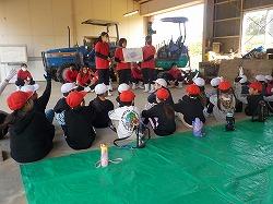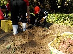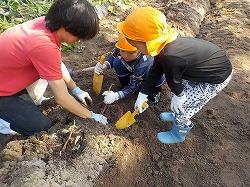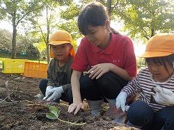 まずは生徒が子どもたちに紙芝居を見てもらい、サツマイモのレクチャーをします。「サツマイモについてわかりましたかぁ~?」と尋ねると「は~い」と大きな返事が返ってきました。その後は生徒とペアになってサツマイモ畑へ向かいます。畑を目の前にやり方を示すと、早速掘り始めました。