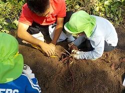 サツマイモの姿が見えると「あったー」と大きな声が上がります。「こんなに大きいよ」「たくさんあるー」「先生、見て見て」「ミミズおったー」など至る所で歓声がわきました。