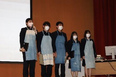 自作した藍染エプロンを身につけて発表を行っている様子】