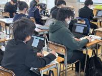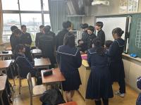 12月17日(水)1・2限、1年4組が家庭科で調理実習を行いました。栄養満点の牛乳をおいしく食べられるアレンジ料理「牛乳もち」です。山田先生の説明を聞いて調理開始、栄養教諭の四藤先生からも牛乳の豊富な栄養素などについて詳しく学びました。楽しい調理の時間の後は、みんなでおいしく味わいました。この授業は1年生の全クラスで今週中に行う予定です。