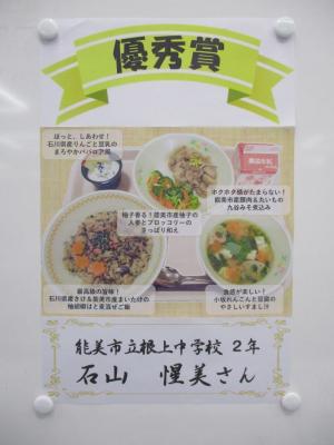 11月21日(金)、石川県庁において給食献立コンクールの表彰式が行われ、2年生の石山惺美さんが優秀賞を受賞しました。石山さんの献立は、能美市や石川県の食材をふんだんに使った栄養満点で彩り鮮やかなメニューです。来年1月末には給食に登場するとのことで、食べられるのが今から楽しみです。石山さん、おめでとうございました!